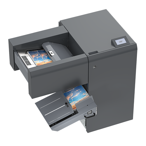 A fully-automated nearline cold laminator that feeds, laminates and trims up to 100 letter-size sheets per minute!